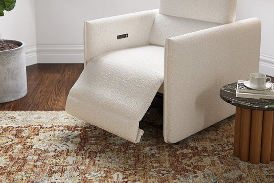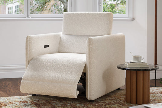 This furniture is crafted with care, using kiln-dried engineered hardwood to prevent warping and ensure lasting durability. The seat and back cushions are super comfy, and filled with high-resiliency foam. For added convenience, it comes with a power recliner mechanism. Control buttons are located out of view on the inner side of the seat to keep the look clean and modern. Modernized with a shelter back, slim arms and tight cushioning for a sleek silhouette, the chair doesn't disappoint in the leisure department.