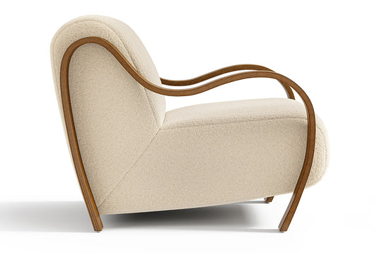 Introducing the Alexis Boucle Fabric Accent Chair - it's got a vintage vibe with a modern twist for ultimate comfort. The design is inspired by European style, and the heart-shaped arms are crafted with bentwood ash veneer in a warm honey finish. The cushion is super comfy and sits on a solid kiln-dried hardwood frame. The fabric's texture is an off-white wool-blend boucle, which feels great to touch and looks timeless. The chair is perfect for making a statement on its own or pairing it with other pieces, and the lux foam and fiber cushioning with sinuous wire suspension make it the perfect balance of style and comfort.
