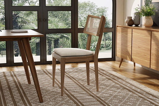 The Harper Modern Woven Cane Dining Chair elegantly combines varying materials, revitalizing a classic design with a modern touch. Crafted from solid wood, its frame boasts clean lines and sharp angles. A distinctively textured cane inlay graces the gently curved back, adding an organic feel. For added comfort, it features a slender, easily detachable cushion upholstered in a resilient fabric, maintaining a sleek and sophisticated look. This blend of natural textures and durable materials makes the chair a versatile and stylish choice for any contemporary dining setting.