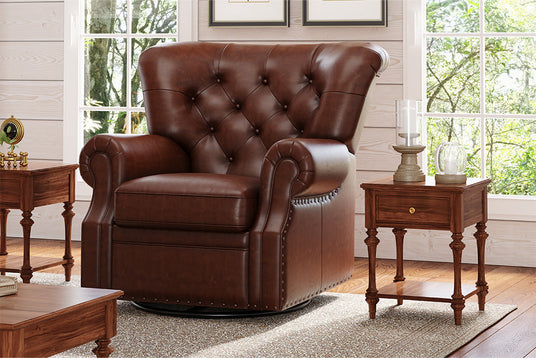 The Liam Leather Recliner Chair, cloaked in a luxurious Lipari Chocolate shade, stands as a resplendent testament to modern furniture design's artistry and craftsmanship. Its English roll arm offers a classic touch, elegantly balancing the blend of past and present aesthetics. Integrated with a swivel mechanism, the chair offers a full 360° rotation, ensuring dynamic functionality without the distractions of tilting or rocking. For those seeking relaxation, its manual recline is seamlessly incorporated, requiring a mere 18" clearance from the wall for a complete recline, allowing you to effortlessly transition into a state of repose. Beneath the rich exterior, the cushions, wrapped in premium polyester, provide a firmer, enduring comfort. And while they are fixed to maintain the chair's form and structure, they ensure a consistent seating experience.