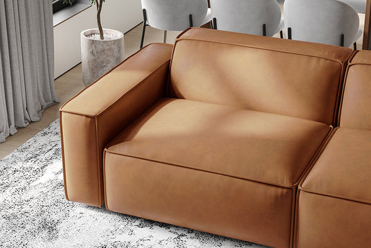 Experience comfort and luxury with the Nathan modular set. Made with high-quality full aniline leather upholstery, solid wood structure, and reinforced multilayer wood, this classic and versatile design fits into any décor. Whether snuggling up with family and friends or lounging peacefully on the semi-firm seats, you can customize it to your needs by adding individual pieces from the same collection.