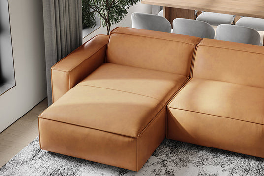 Create the perfect lounging space with the Nathan Leather Modular Sectional Sofa set—a classic design crafted from high-quality full aniline leather that complements any décor. The semi-firm seats offer unbeatable comfort, while the versatile design allows for peaceful lounging. Customize your seating arrangement by adding individual pieces to the three-piece set. With a structure made of solid and reinforced multilayer wood and high-resilience polyurethane foam for comfort. The medium-firm seat set is finished on all sides. This masterpiece is slightly treated to maintain its natural characteristics, but avoid exposing it to direct sunlight as it may cause discolorations. Expect natural markings and color variations as well. Adding an individual piece over time or slight differences between dye lots can cause color differences. Clean with a white, soft, dry cloth and blot any spills immediately to dry naturally.